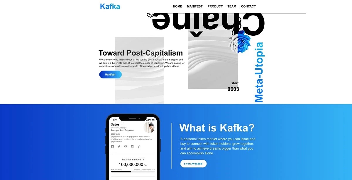 個人のトークン市場を通じた資金調達の社会実装を目指すプロジェクト。旧来の価値評価システムを乗り越える経済圏の確立、個人の株式市場〈 Kafka 〉の設計に挑みます!