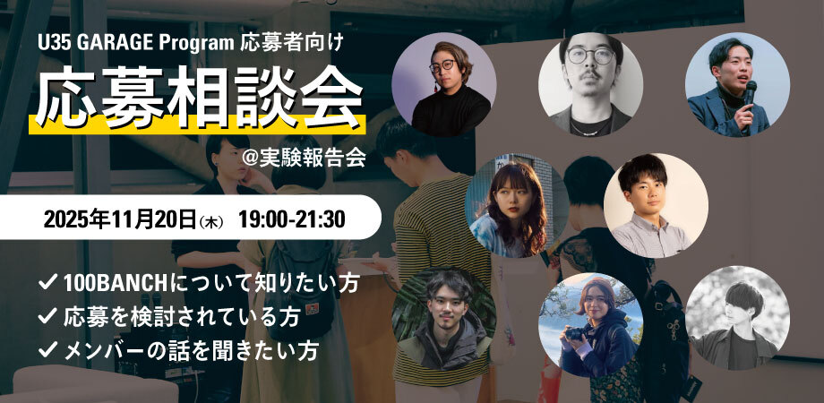 GARAGE Program応募検討者の皆様へ向けたガイダンスも実験報告会当日に実施します。100BANCHの概要説明や応募にあたっての質疑応答、施設見学などを予定しております。