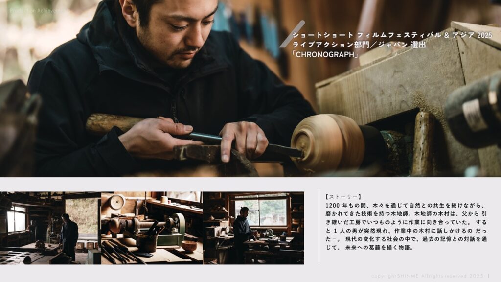最近の活動では、制作総指揮として向き合った木地師を題材にした作品で、アジア最大級の国際短編映画祭「Short Shorts Film Festival & Asia 2025」や国際観光映像祭2024で入選させていただきました。大阪・関西万博でもプロジェクションマッピング作品に選出いただき、1ヶ月ほど万博で上映され、「大阪ヘルスケアパビリオンリボーンステージ」イベントでゲストスピーカーとしても登壇しました。