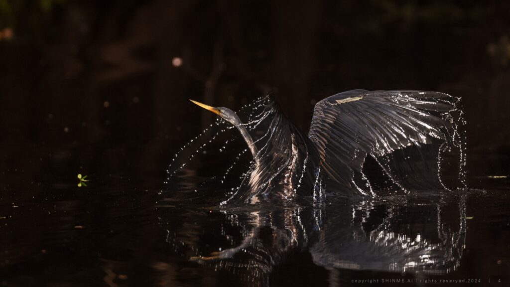 髙野:先日、ボルネオに行ったときには、この「アジアヘビウ」が首まで川に浸かった状態から飛び立つ瞬間に出会いまして、飛び立つときのしぶきの様子がなんとも力強く綺麗でした。そういった瞬間は、やはり自然写真家の冥利だなと思います。ただ、このような場所に人間がどんどん踏み込んでしまうことで、生態系に影響を与えてしまいます。そういった側面も意識しながら、とはいえ、伝えなくてはいけないことや自分が撮ることの意味を常に考えるようにしています。