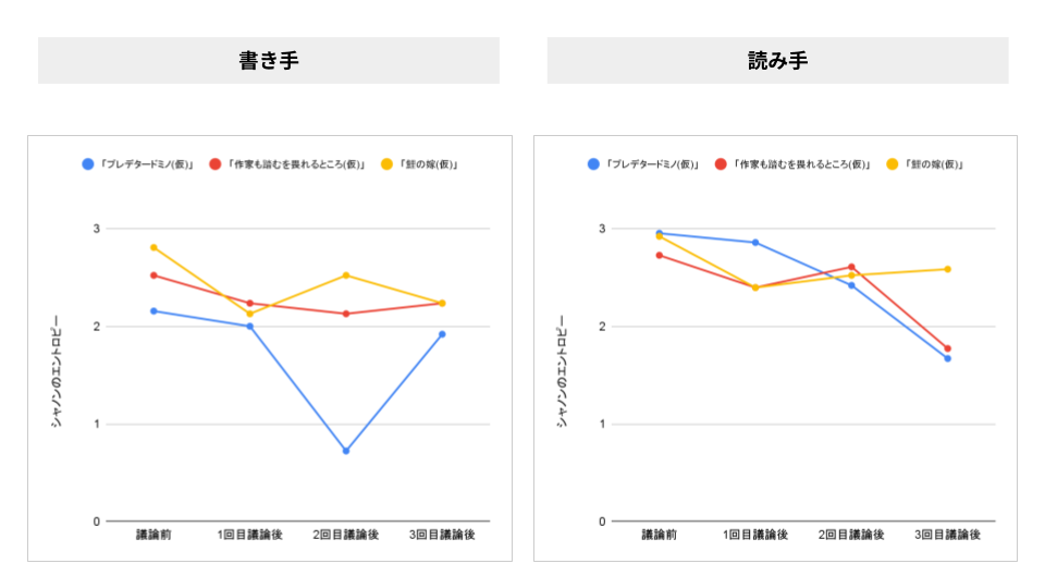 まず1つ目の検証点は、「議論をするにつれ、票が特定の作品に集まっていったのか?」について。作品の投票傾向について、シャノンのエントロピー(数値が大きいほうがばらつきが大きい)の時系列推移をみていくと、『プレデタードミノ(仮題)』と『作家も踏むを畏れるところ(仮題)』は議論によって投稿される作品がまとまりつつある傾向が見られた一方で、『鯉の嫁(仮題)』は途中で作品がまとまりづらくなっていました。