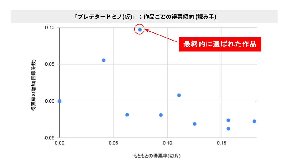 2つめの検証点である「議論によってどのような物語が選ばれたのか?」について見ていくと、興味深い特徴が見られました。最終的な投票で得票率が高い作品は、最初から票を集めていたものというよりは、議論を経るごとにスコアを上げていった作品が多いという傾向があったのです。図に示しているのは一例ですが、最終的に選ばれた作品は、「最初からもっとも票を集めていた作品」ではなく、議論によるスコアの上昇度合い(回帰係数)が最も大きかった作品でした。