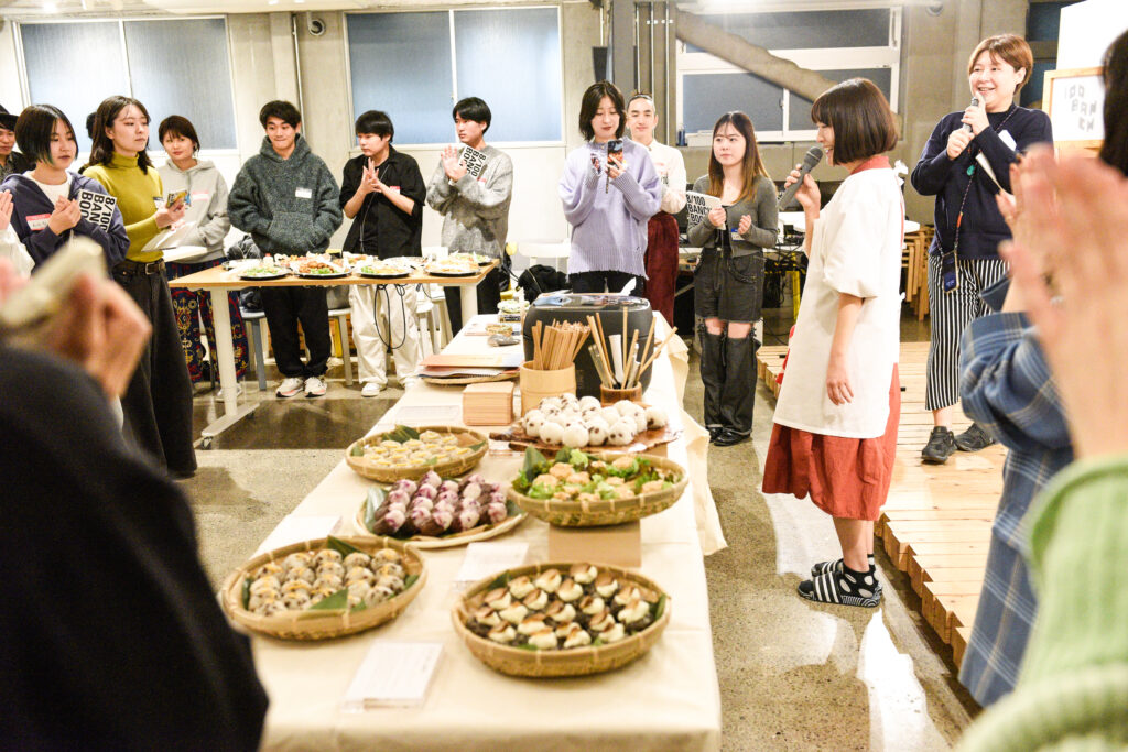 その後の懇親会では、食事を囲みながら、お互いの活動について相談したり近況を語り合いました。今回のケータリングは、「旅するおむすび屋」として食の大切さや楽しさを届ける活動を行う菅本 香菜(GARAGE Program 2期生|MUSUNDE HIRAITE)様々な種類のおむすびを提供。100BANCHの場所から着想したテーマで、この日のためにメニューを考案してくれたそうです。