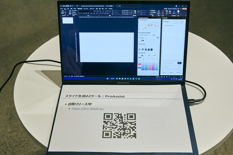 そこで、今回、AIに実務的につくらせるものの対象として、スライドを選びました。より実務に特化したスライドツールということで、ユーザーがデザインや構成などを言語以外でAIに伝えられる、総合的にスライドづくりを便利にするAIアプリケーション「Pro Assist」を開発しています。パワーポイントに埋め込んだアプリケーションで、直感的なデザインをAIに指示できたり、各パーツごとに細かい修正も受け付けてくれます。例えば「GDPをプロットしてくれ」と指示すると、調べてきてグラフにして、プロットしてくれて、理由などを箇条書きで出してくれたり、より実務的なパワポアプリになっています。現在、ベータ版をリリース済みで、色々フィードバックをいただいて改善をしている最中です。