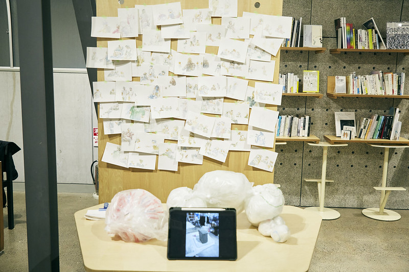 アプローチとしては、ドローイングのフェーズを拡張してそのまま施工に用いることができないだろうか、というもので、展覧会などを通して活動してきました。「深夜の美術展」という展覧会では、何気ない日常を描いた風景をパースラインに沿って切り取ることで、空間を描くことには、絵であるからこそ、フィジカルな限界があるということを表現しました。「しもまちシェアハウス」という新潟の古い長屋での展示会では、背景を白抜きにして人だけを描いた絵を、改装途中の建物に飾るという挑戦を行いました。さらに、描いたドローイングから何かモノがつくれないだろうかという試みとして、ワークショップも開催しましたが、あまり上手くいきませんでした。11月には、私が住んでいるシェアハウスを舞台に住民を描かせてもらい、空間にあるものを、ドローイングを媒介にして表現することはできないか実験を行ったり、「Tokyo Innovation Base」 での展示を行ったりしました。