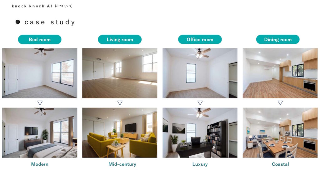 加藤:また、不動産向けには「knock knock AI」というサービスも展開しています。何もない部屋の写真に、AIが自動で家具を配置するものです。ガランとした部屋よりも生活イメージが湧きやすく、導入した不動産会社さんでは購入率が1.5倍〜2倍に上がるという結果も出ています。