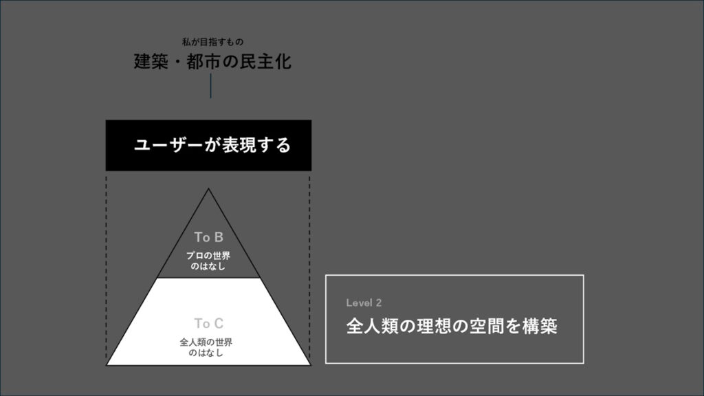 今日は、僕が掲げている「建築・都市の民主化」についてお話しさせていただきます。 この民主化には、大きく分けて「ユーザーが表現する」ことと、「ユーザーを分析する」ことの2つの側面があると考えています。
