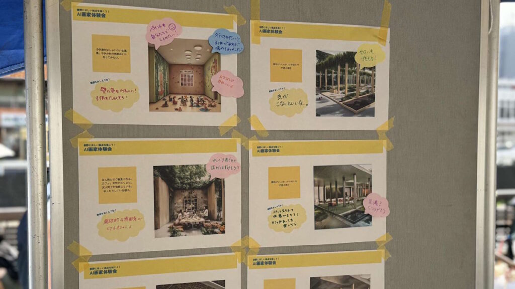 秦野市や芝浦工業大学との都市計画ワークショップでは、子どもたちが理想の街を描き、さらに「なぜその街がいいのか」を言葉でコメントしてもらいました。 画像をつくるだけでなく、そこに言葉やこだわりが乗ることで、自分たちが住む空間や都市への解像度がぐっと上がっていきます。これも新しいコミュニケーションであり、民主化の形だと考えています。