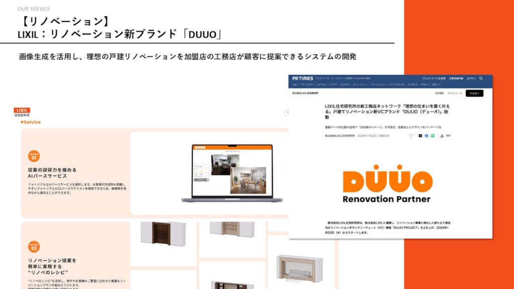 加藤:ちょうど本日発表された取り組みとして、LIXILが推進する新しいリノベーションのあり方を検討するブランド「DUUO」において、当社は立ち上げ初期より技術面を中心にサポートさせていただいています。募集されたパートナー企業にシステムをご活用いただき、注文住宅ほどの時間や予算をかけずに理想の住まいづくりを目指すプロジェクトです。加盟工務店が利用可能なシステム開発の一部支援に加え、活用方法の整理など、円滑な運用に向けたお手伝いをしています。