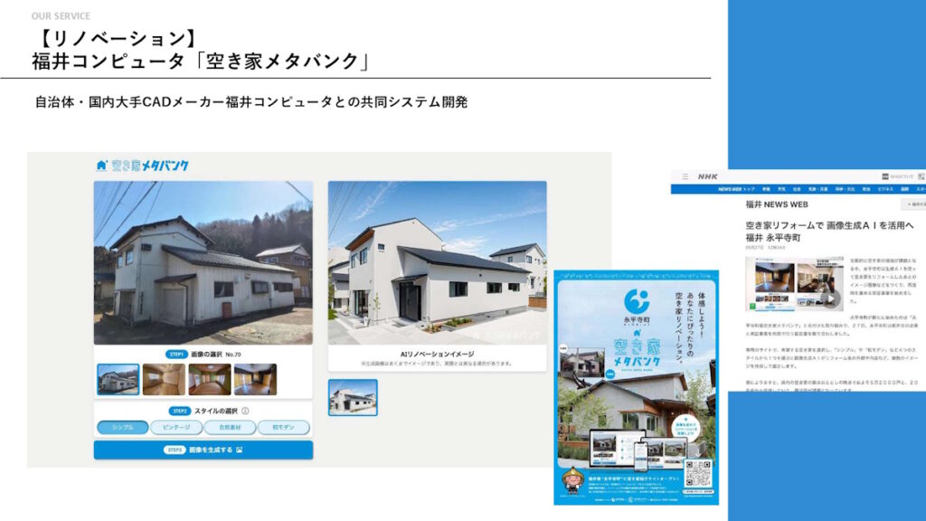 加藤:例えば、自治体の「空き家バンク」の課題解決にも取り組んでいます。空き家バンクの写真はどうしても古びていたりキレイでないように見えてしまいますが、「リノベーションしたらこうなる」という素敵なイメージをAIで生成することで、移住や購入のハードルを下げることができるのではないかと思っています。