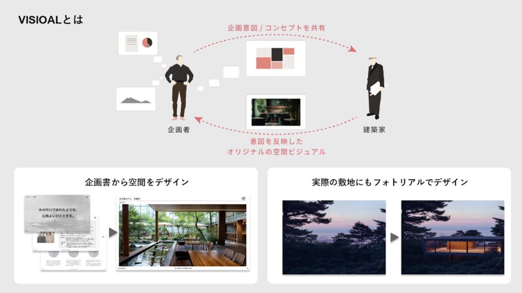 最近はじめた「VISIOAL」というサービスは「建築家版タイミー」のようなもので、建築家と、新しくホテルやテーマパークなど、何か空間をつくりたい不動産会社などの企画者をマッチングするサービスです。画像生成AIを活用しながら、よりスピーディーにイメージを具現化していく伴走支援をしています。設計の前段階から建築家が伴走するという新しいプロセスをつくることで、新しい建築のあり方を生み出そうと取り組んでいます。