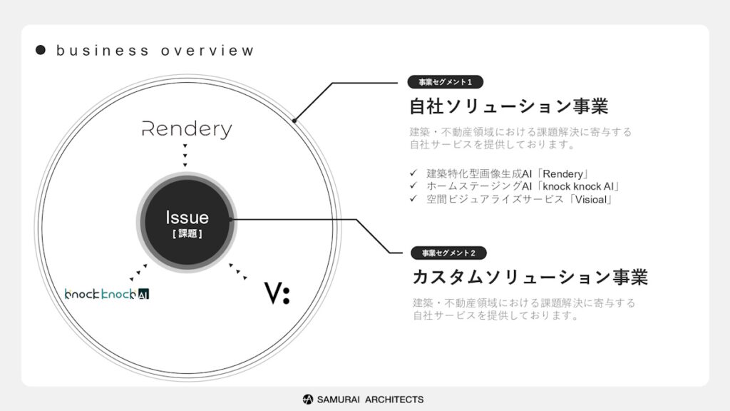 僕たちの会社は、「建築×AI」をメインフィールドにしています。建築・建設はもちろん、不動産、そしてそれらが集まった都市計画や地域活性化まで活動の幅を広げています。会社の事業としては大きく2つあって、1つは、100BANCH時代にも取り組んでいた「Rendery」のような自社サービスの提供で、もう1つは、ゼネコンや設計事務所の皆さんに対するシステム開発の受託、カスタムソリューションです。