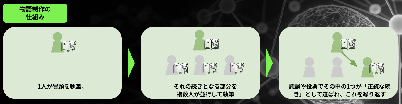 「Novel Colony」は、「複数人で物語を紡ぎ、民主的な方法で続きを選び取っていくことで、人々の違い・対立を乗り越え、誰もが楽しめるような物語を生み出せることができるか?」という問いを、実際に物語を作ることで検証するプロジェクトです。