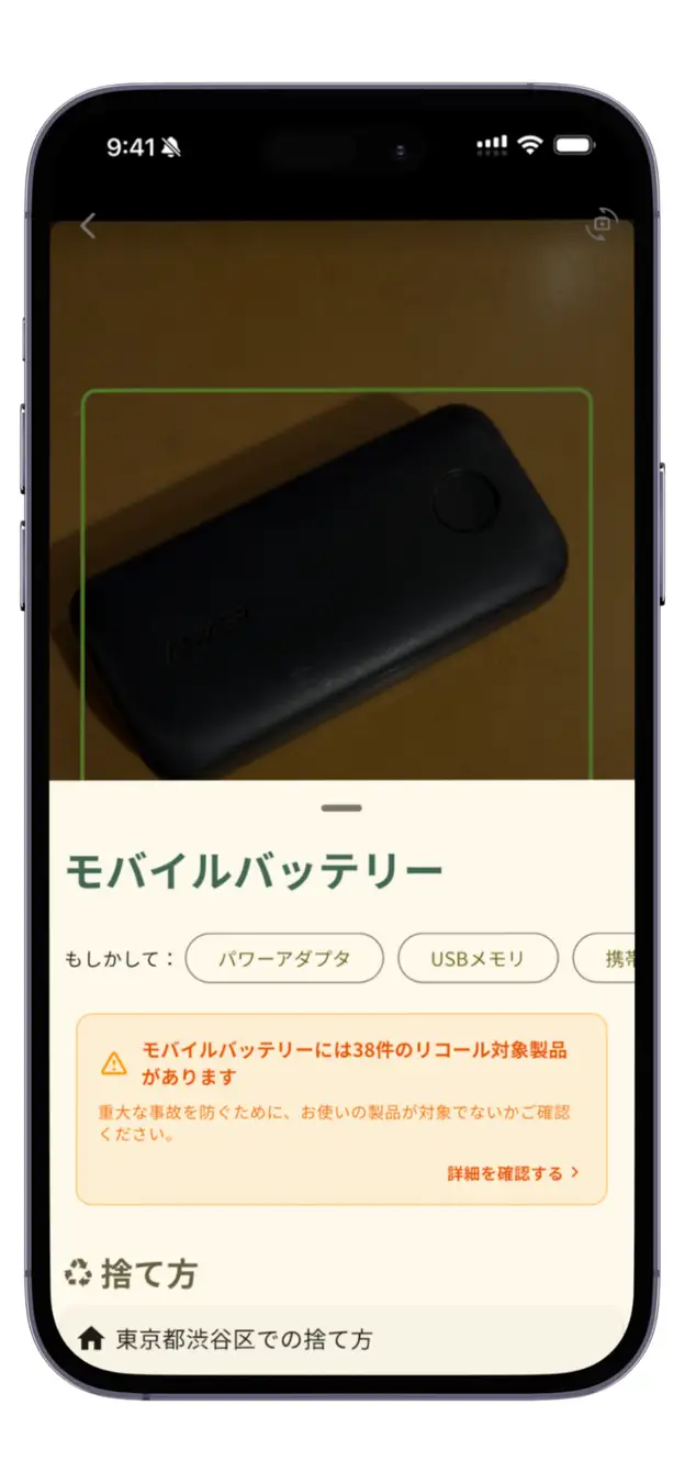 この度「Trash Lens」に追加されたリコール情報確認機能では、モバイルバッテリーをスマートフォンで撮影するだけで、AIが画像から型番やメーカー情報を読み込み、関連するリコール情報の有無を即座に表示します。