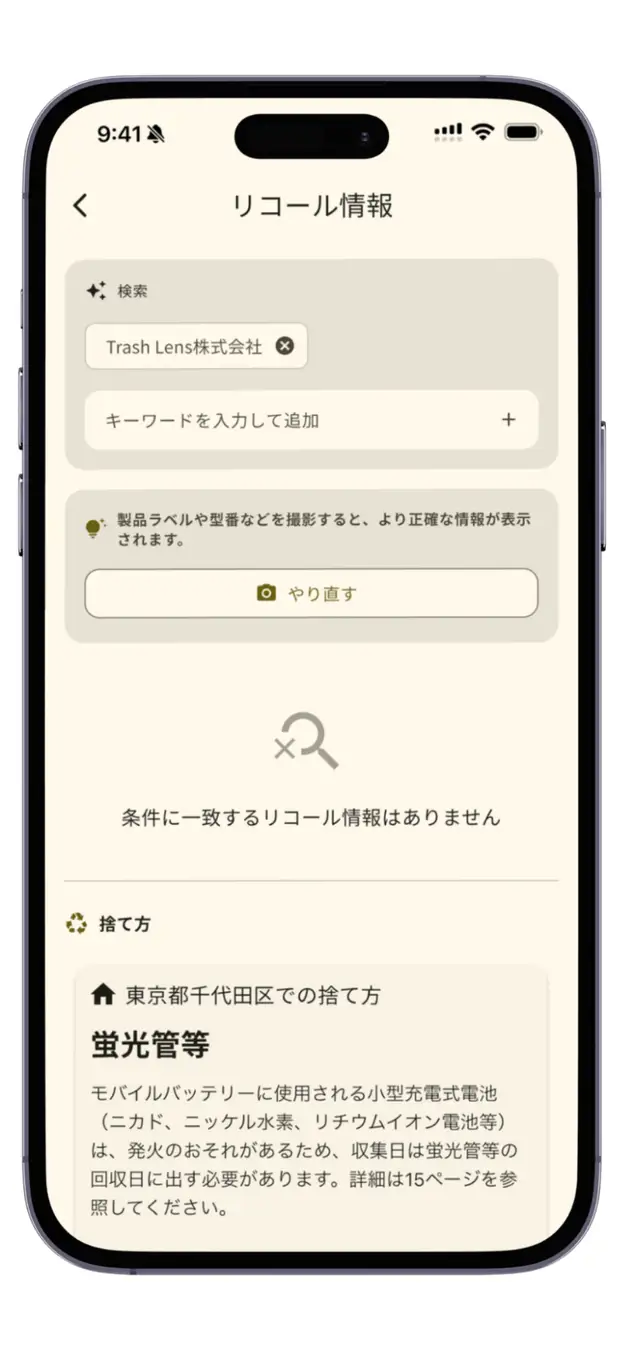 リコール対象製品であった場合は、メーカーの回収窓口やリコール詳細ページへのリンクを提示し、ユーザーが速やかに対処できるようサポートします。また、リコール情報が見つからなかった場合でも、お住まいの自治体での分別情報や、適切な廃棄方法を確認することが可能です。