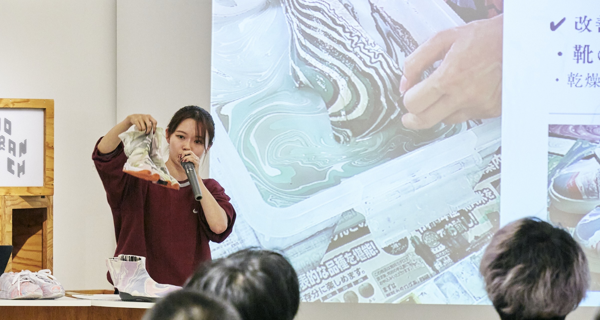 この3ヶ月では、まず、100BANCHでスニーカーづくりを体験をしてもらいました。関西が発祥だといわれている「墨流し」という技法を使って、水の上に色々な墨やインクを垂らして模様をつくり着色し、自分だけのスニーカーをつくる体験です。帰国子女の方や在日フランス人の方など、15名以上に体験をしていただき、すごく満足していただきました。結果として、靴の素材によってクオリティにばらつきが出てしまったり、一回で染まりきらなかった場合には色が弱くなったり、小さなバグや改善点などを見つけることができました。次に、伝統工芸を扱うということで、いろんな工房にお邪魔して視察させていただきました。奄美大島の大島紬、金沢の友禅染、京都の染工房でも色々と視察に伺いました。また、アメリカの日本の外務省の拠点に行き、海外の方が日本のことをどう見ているのかなどを視察してきました。そういった中で、やはり伝統というと着物などキャッチーなものに行きがちだということを痛感し、あらためて伝統文化と身近にあるものを掛け合わせるのはすごく大事なのではないかと思いました。