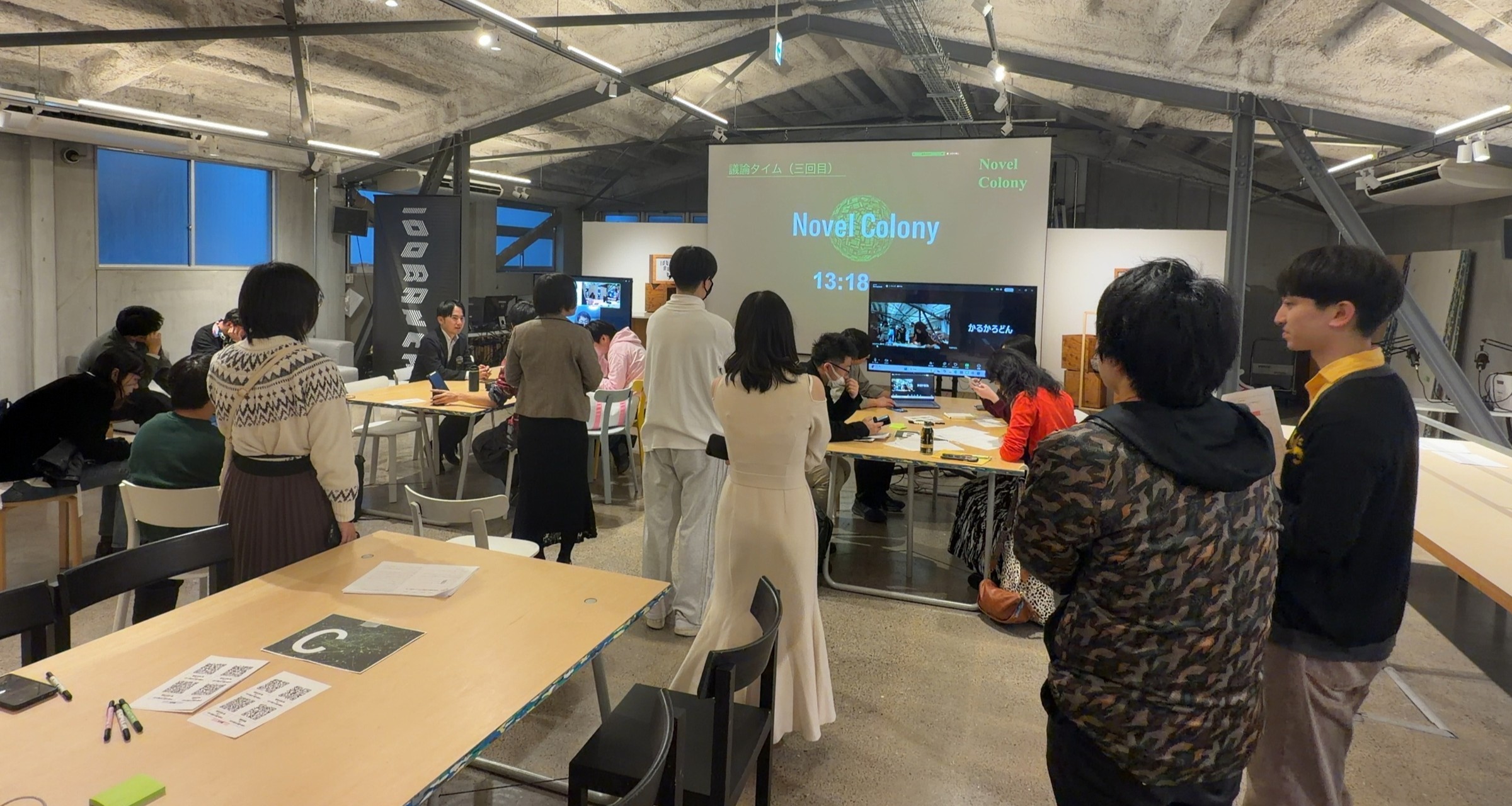 舞城王太郎先生に寄稿いただいた 『プレデタードミノ(仮題)』『作家も踏むを畏れるところ(仮題)』『鯉の嫁(仮題)』3作品の続編パートを題材に、議論データの収集を目的としたイベントを実施しました。当日は48本の続編候補をもとに、総勢50名の「書き手」と「読み手」が100BANCHに集合。議論そのものの変化や情報が議論へどう影響与えるのかを観測するため、双方の役割を分け、「書き手」は議論と投票を担当し、「読み手」は判断材料となる情報を提供する形式で進行しました。